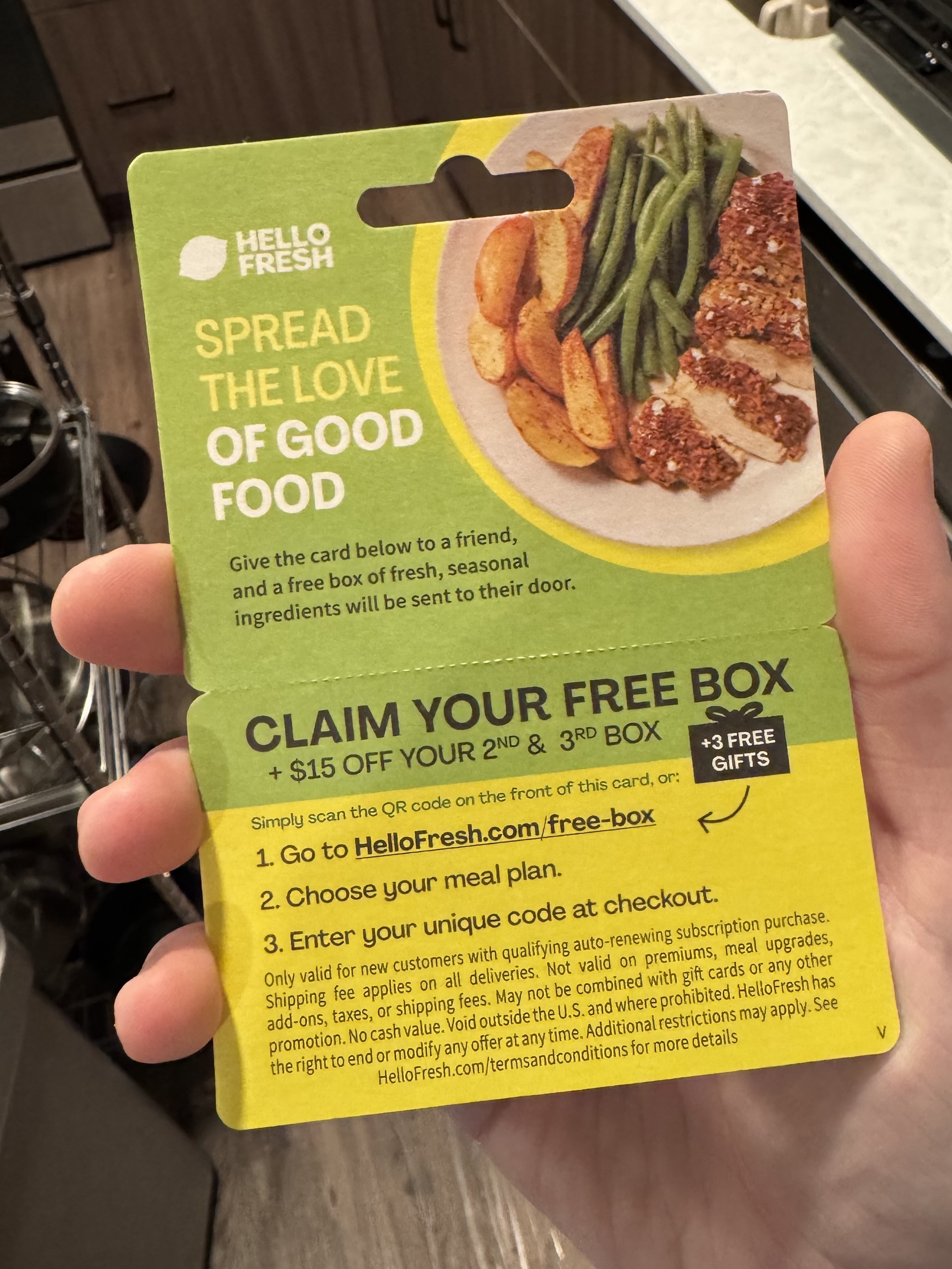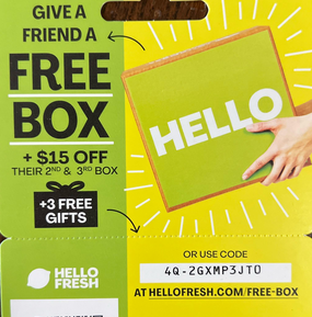 in the bottom of the hello fresh box was ... another free box code, however its intent clearly stated as to be given to a friend. well, despite the turmoil and conflict we often have, i momentarily called truce so that myself and i could agree to consider ourselves to be friends.